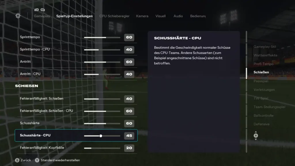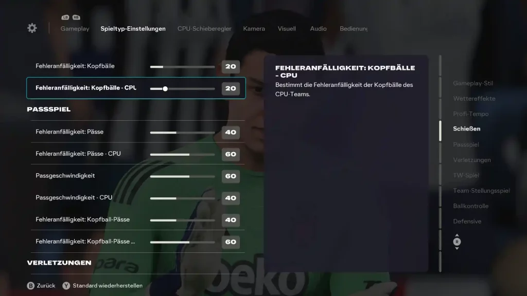 EA hat an den Slildern kräftig gearbeitet, um ein möglichst realistisches Spielerlebnis m EA FC 26 Karriermodus zu schaffen. Die Fehlerwahrscheinlichkeit bei Abprallern ist auf 90 hochgesetzt. Bei der Ballannahme auf 60. Die Geschwindigkeit für Sprints ist stark reduziert, auf 35, für Spieler und CPU. Es ist also ein großer Zufallsfaktor eingebaut, die Fehlerhaftigkeit von Schüssen auf 60 eingestellt.