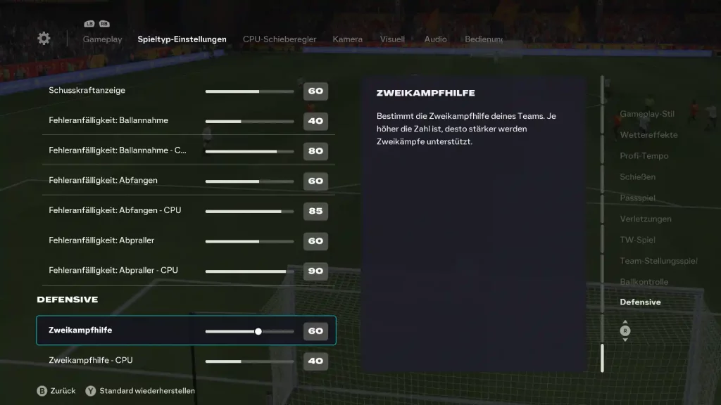 Ihr könnt euch ganz viel selbst einstellen. Wind- und Wettereffekte kann man stark odre schwach einstellen mit ihren Auswirkungen im EA FC 26 Karrieremodus. Aber Vorsicht: Das verändert die Ballphysik enorm! Der Wetkampf-Modus sorgt dafür, dass Pässe, Schüsse und viele andere Aktionen CPU-unterstützt einfacher von der Hand gehen.