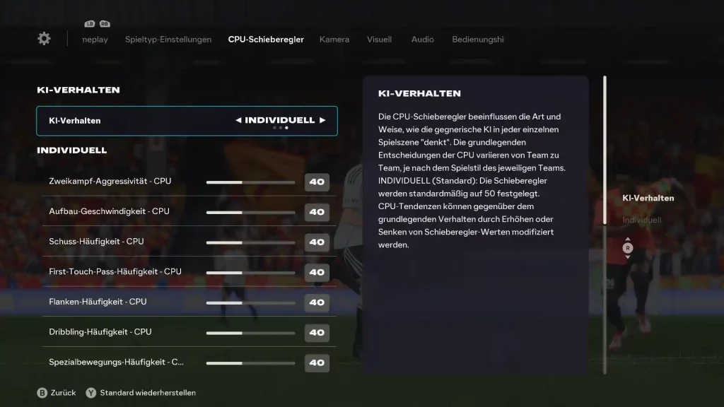 Man kann sich das authentische Gameplay im EA FC 26 Karrieremodus anpassen! Dazu dieses einfach einstellen, und dann aber auf „individuell“ wechseln. So bleiben alle Einstellungen intakt, man kann aber die Sprint- und Tempowerte hochsetzen. Wer es noch etwas einfacher machen will, setzt die hohen Stellungsspiel- Defensivwerte etwas niedriger an.