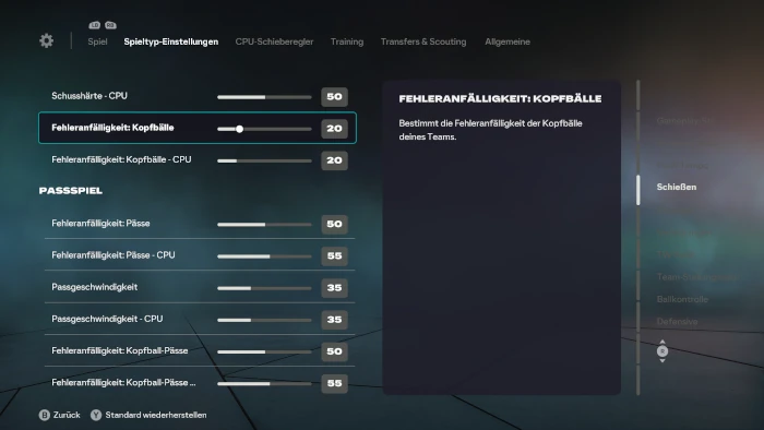 Dann habe ich die Fehleranfälligkeit bei Schüssen auf 50 gesetzt und die Schusshärte ebenfalls. Bei der Fehleranfälligkeit für Pässe und Kopfbälle habe ich meine Werte auf 50 angepasst, die der CPU etwas höher. So ist es im EA FC 26 Karrieremodus ausgeglichen und realistischer.